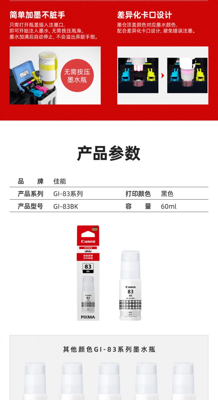 商品名称:佳能/Canon 墨水 GI-83BK 3800页 适用于G680/G580黑色 (单位:支)